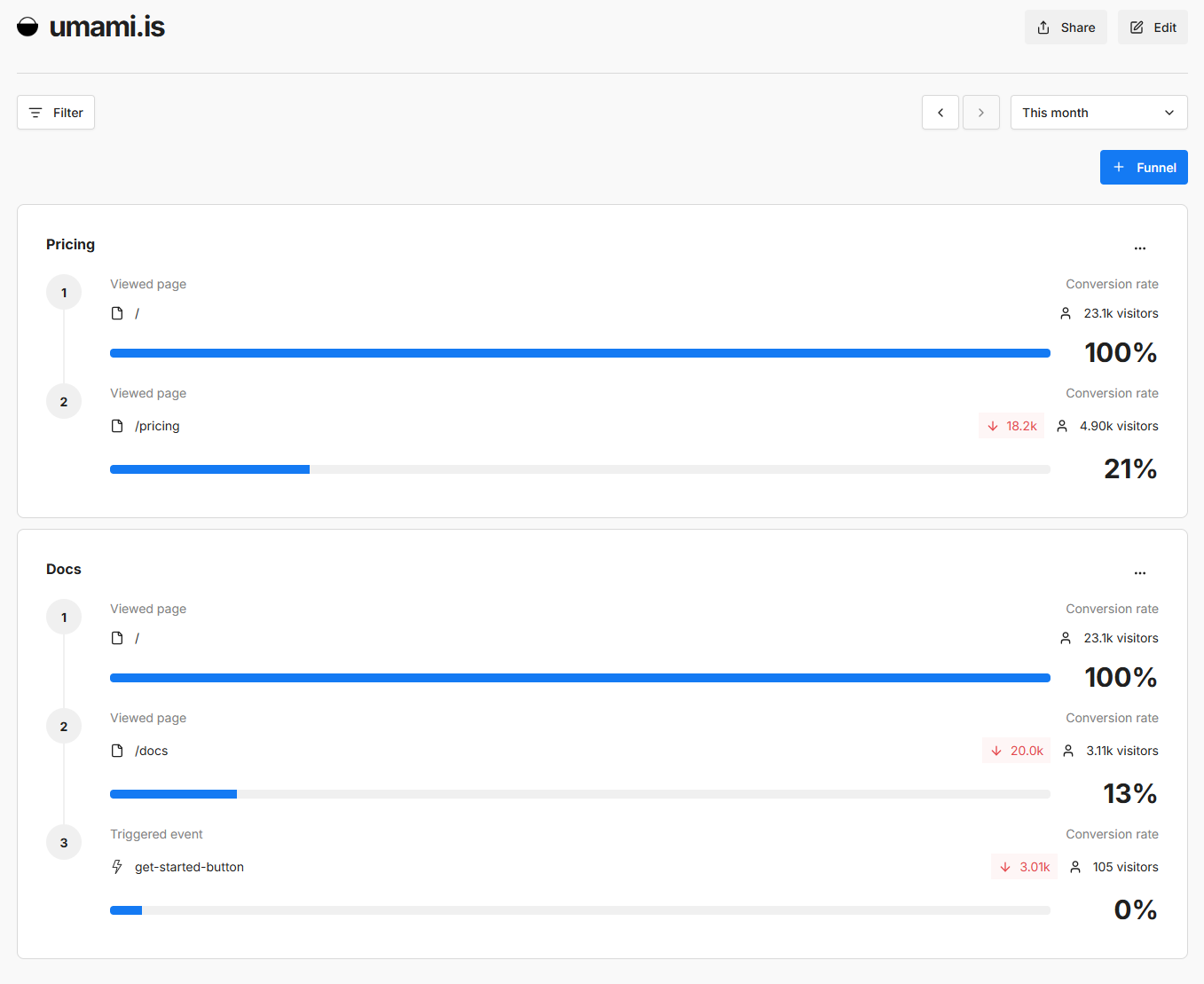 Umami 提供極簡且現代的視覺化介面,將網頁瀏覽量、不重複訪客、跳出率等關鍵指標整合在單一畫面中。無需繁雜的操作流程,使用者可以在數秒內即時監控目前的在線人數,並深入洞察訪客來源路徑與熱門內容。